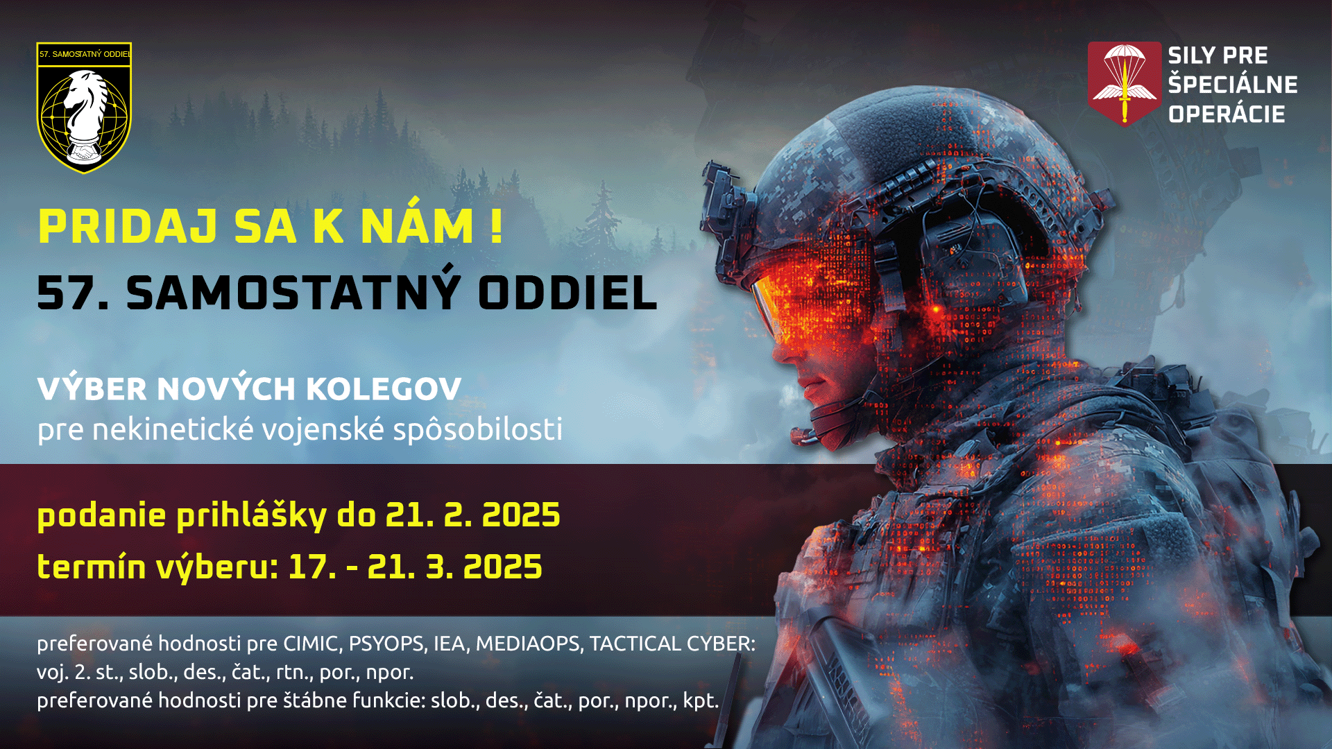 Ak ešte nie si profesionálny vojak a chceš slúžiť u nás, podaj si prihlášku do Ozbrojených síl SR s cieľom slúžiť v 57. samostatnom oddiele – v základnom výcviku Ťa oslovíme! à wwww.budemvojak.sk